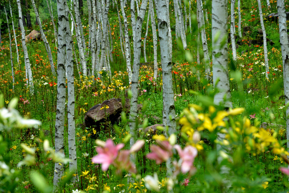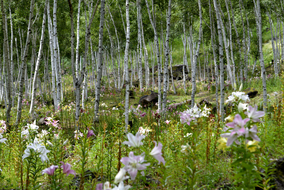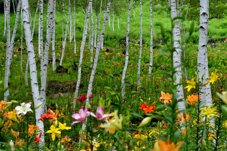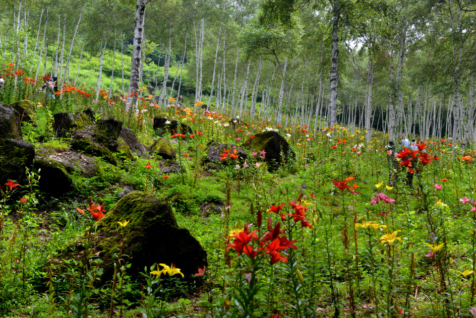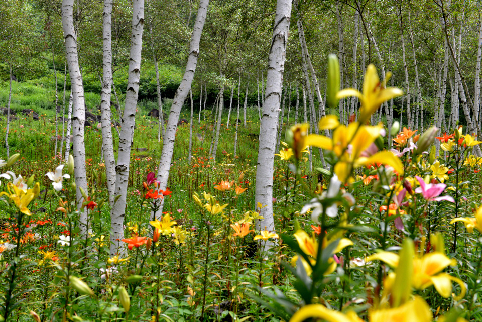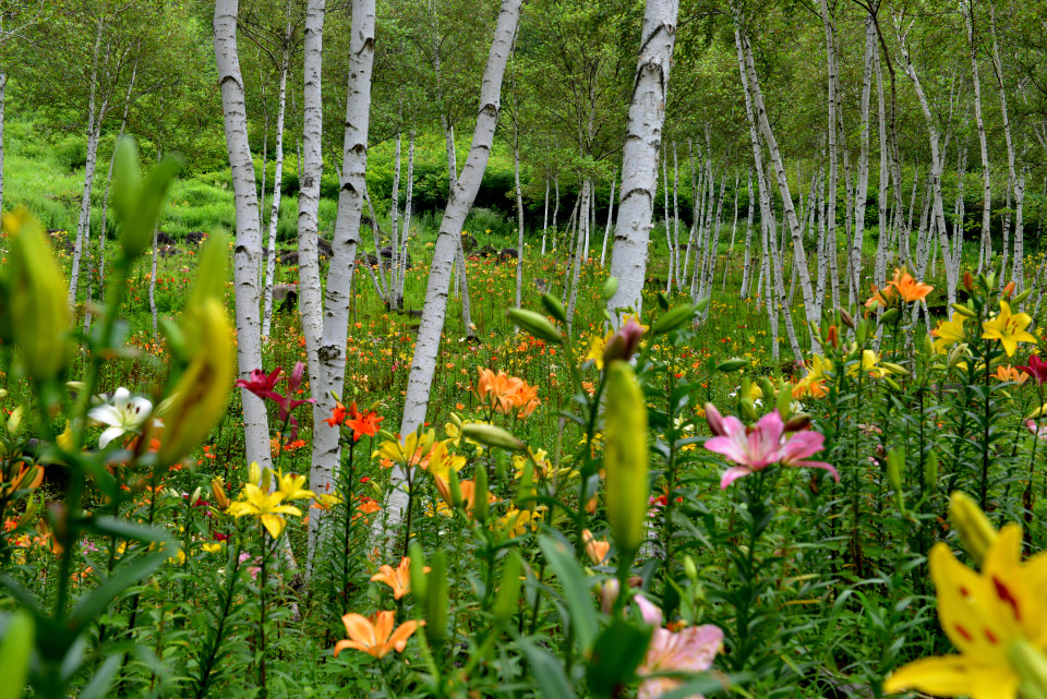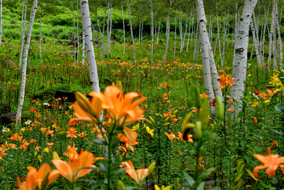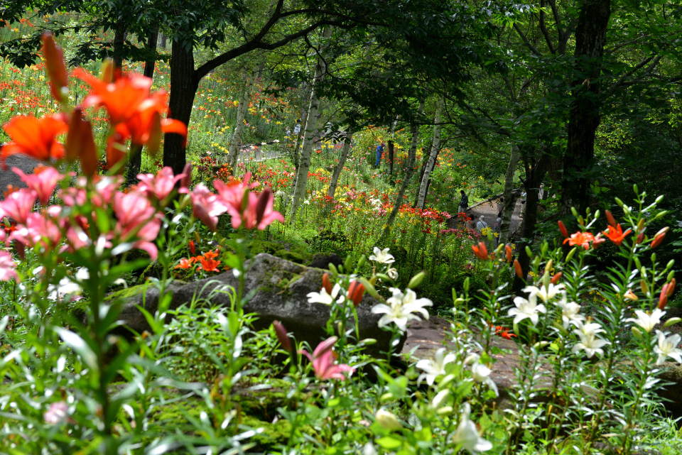 長野県諏訪郡にある「富士見高原花の里(旧ゆりの里)」のキスゲやゆりの様子です。
